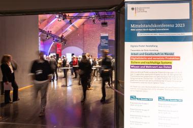 Die Mittelstandskonferenzen nehmen jeweils aktuelle Herausforderungen in den Blick. Mit insgesamt rund 400 Teilnehmenden ist sie eine der größten Netzwerkveranstaltungen ihrer Art in Deutschland. Im Jahr 2023 stand die Innovationskraft der KMU im Fokus. Herzstück der Konferenz war eine digitale Posterausstellung, bei der in mehreren Durchläufen verteilt auf 40 Monitore insgesamt 190 Projektposter präsentiert wurden. Sie zeigten die Bandbreite der in den BMFTR -Programmen KMU-innovativ und KI4KMU geförderten Projekte, für deren Umsetzung weitgehend der DLR Projektträger verantwortlich ist. Die Auswahl der Poster sowie die inhaltliche Strukturierung der Ausstellung oblag dem DLR Projektträger.